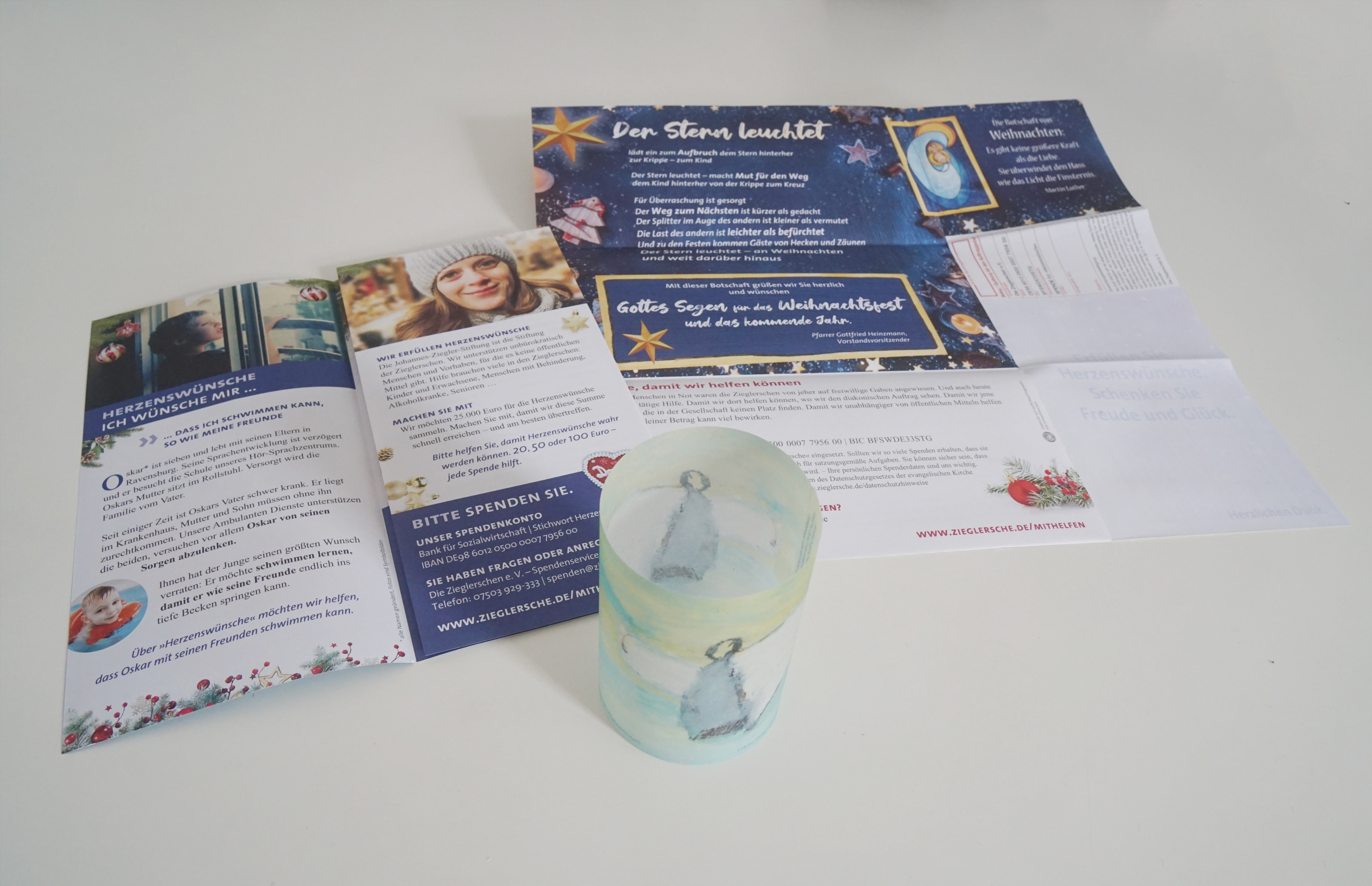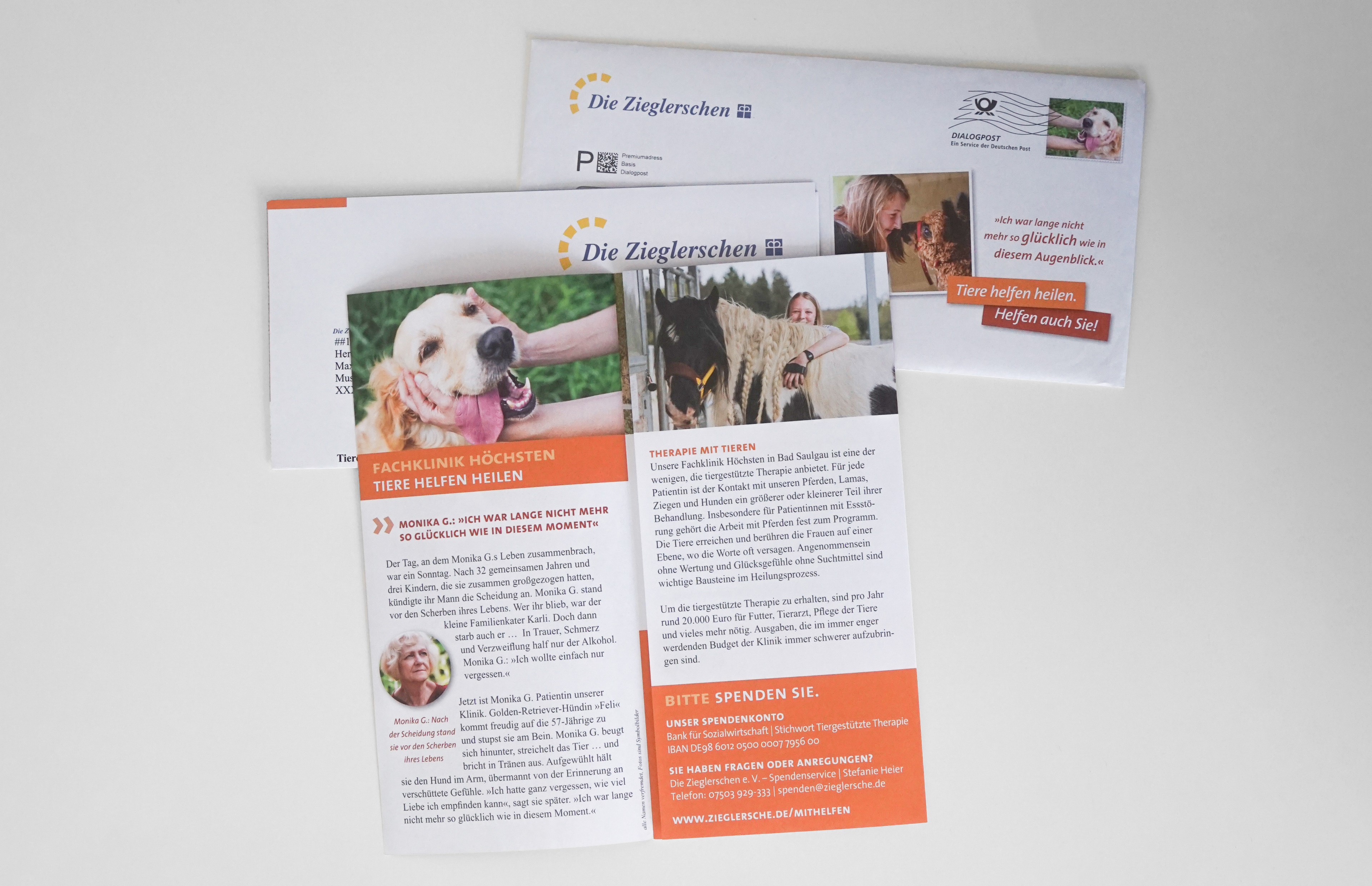Mehrmals pro Jahr informiert das diakonische Unternehmen Die Zieglerschen über aktuelle Projekte und wirbt um Spenden mittels personalisierter Mailings. Für die Agentur nullzwei – Büro für Gestaltung und Kommunikation gestalte ich Spendenmailings seit 2012. Der Umfang variiert – manchmal ist es nur ein Brief mit Hülle, manchmal sind Flyer und kleine Verstärker beigelegt.