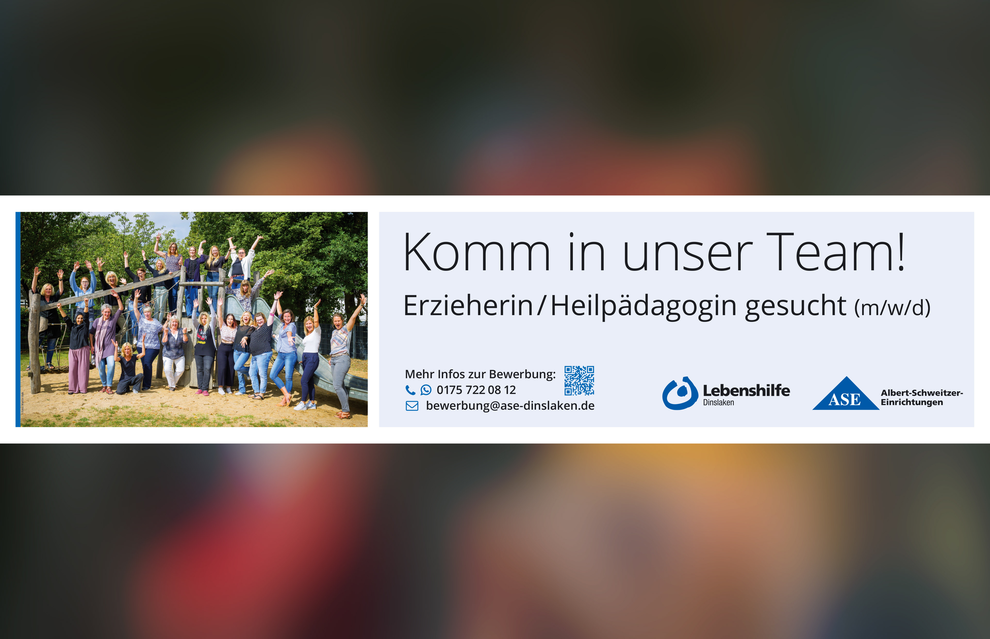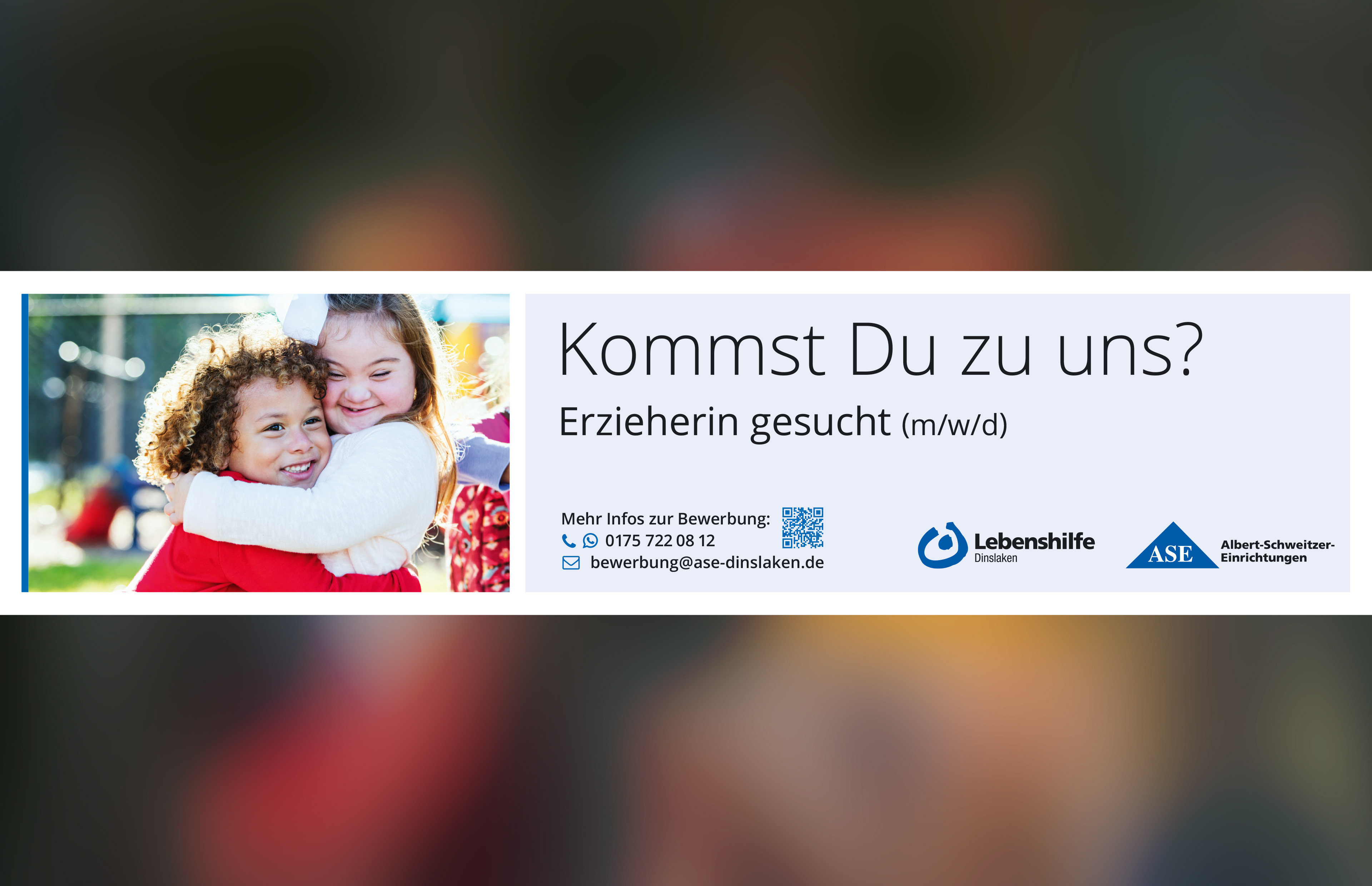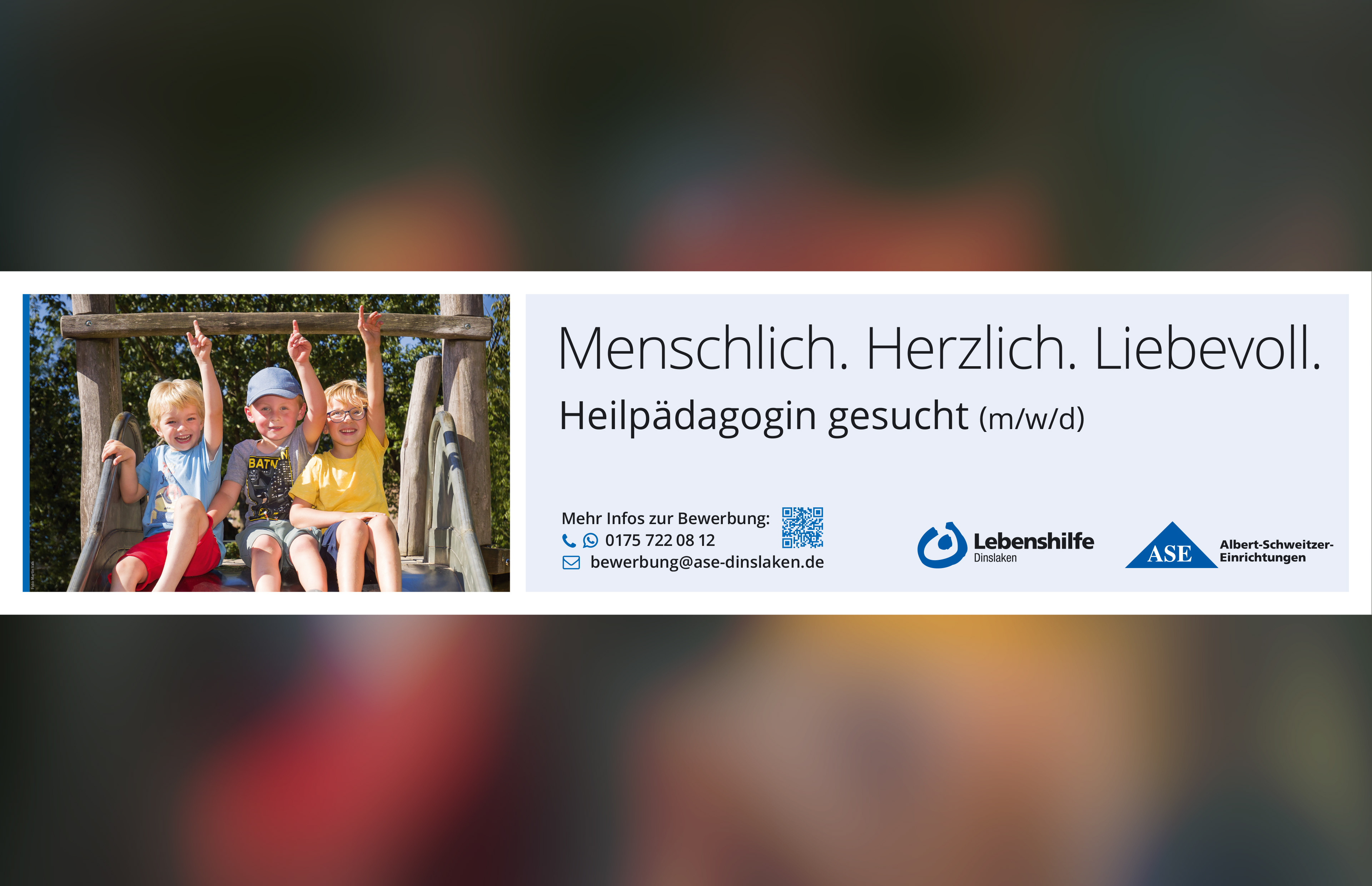 Großfomatige Banner, die am Zaun befestigt wurden, unterstützen die Lebenshilfe Dinslaken erfolgreich bei der Suche nach neuen Mitarbeiterinnen und Mitarbeitern. Gestaltung, Visualisierung und Reinzeichnung im Aufrag von Agentur nullzwei, Köln.
